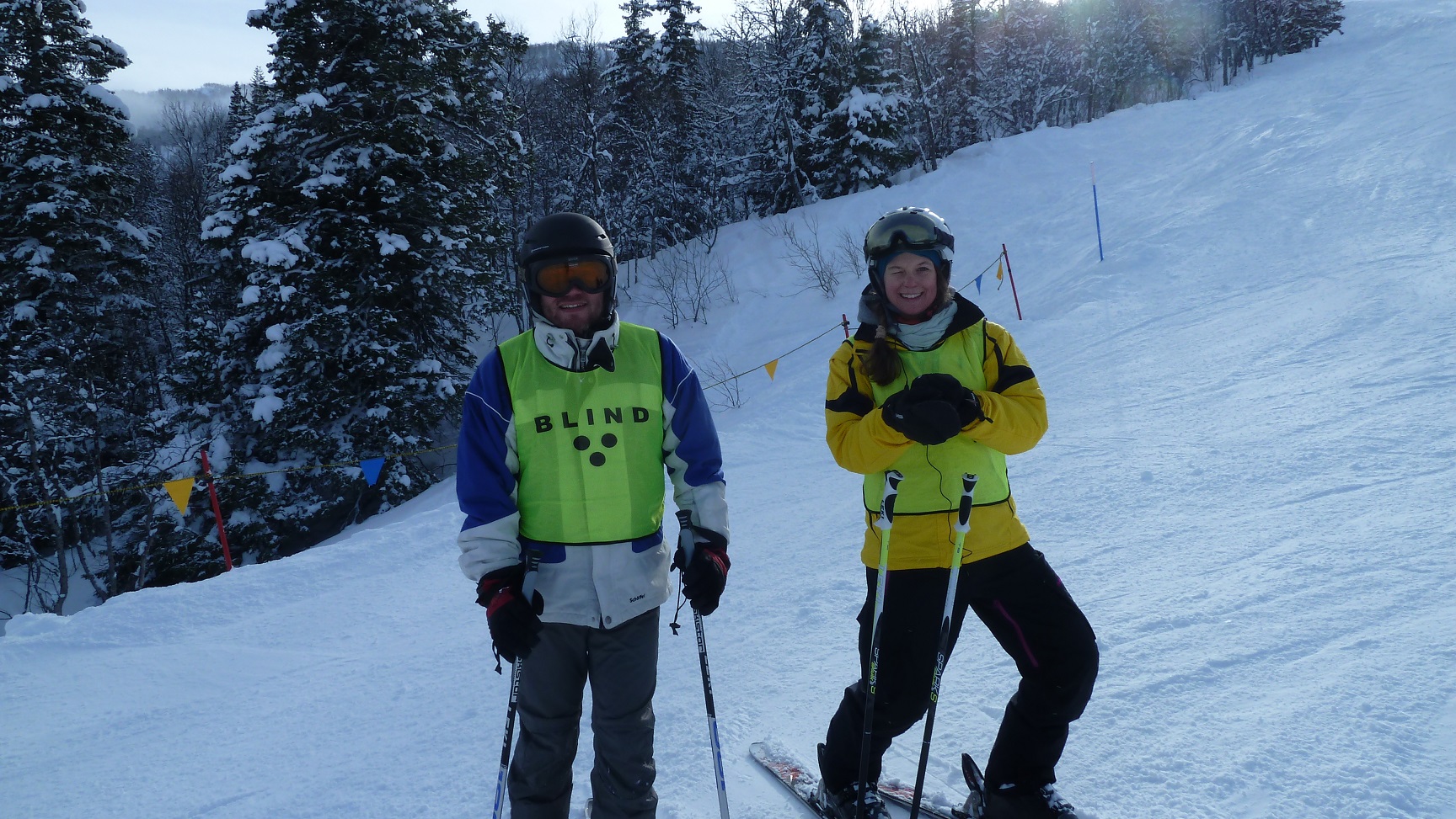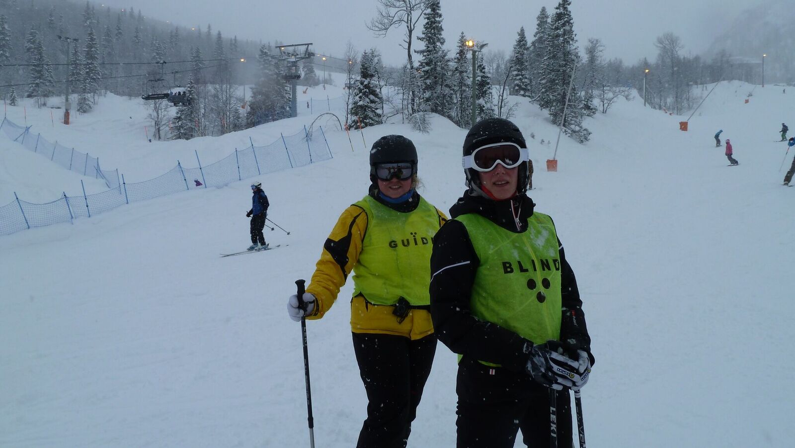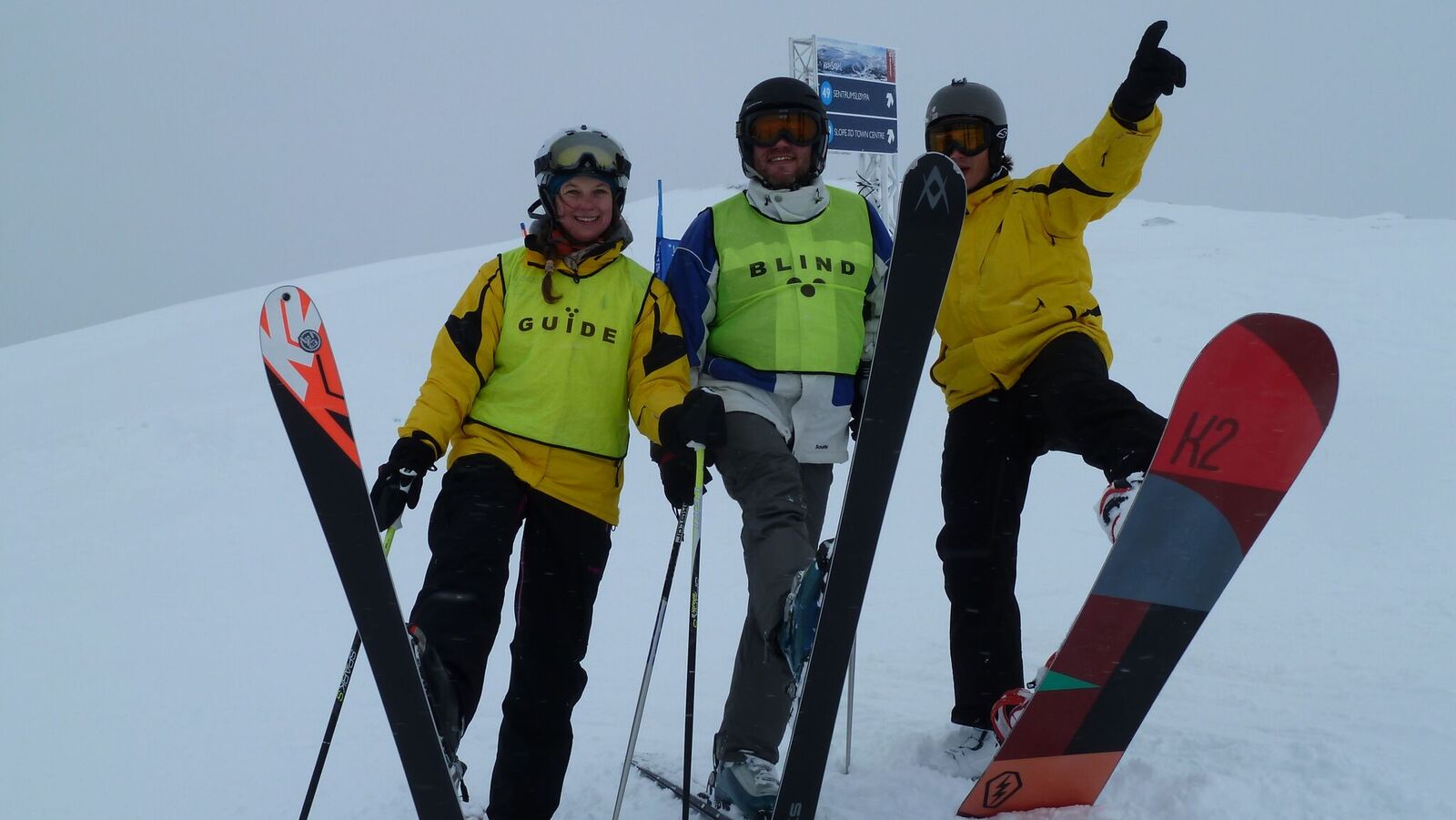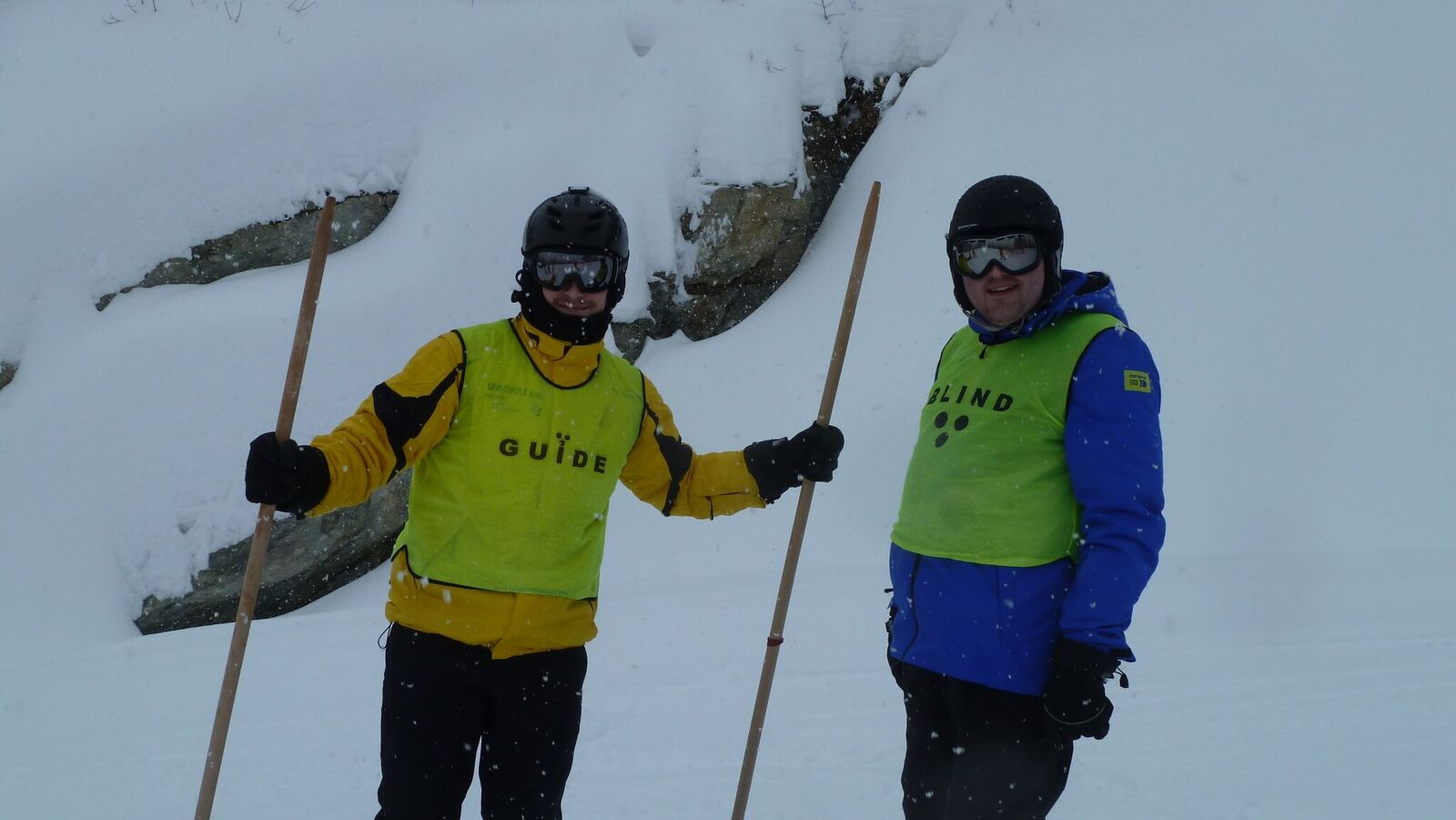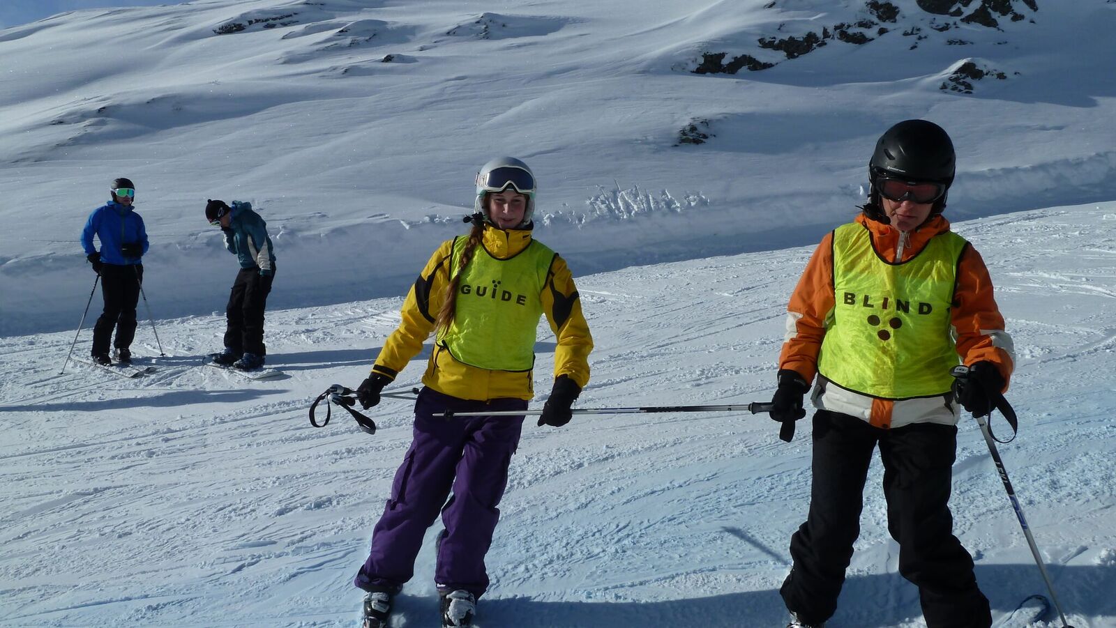 - Guide und sehbehinderte Skifahrerin vor einem Bergpanorama