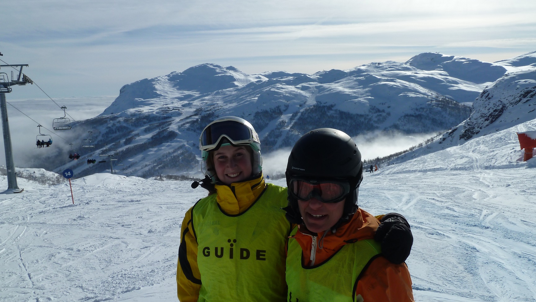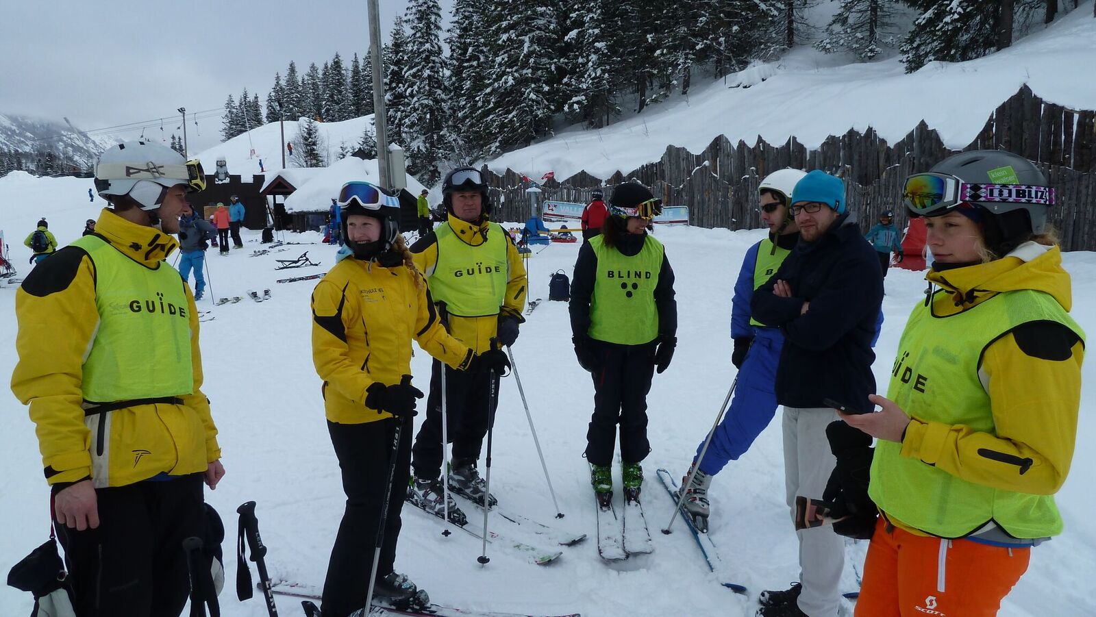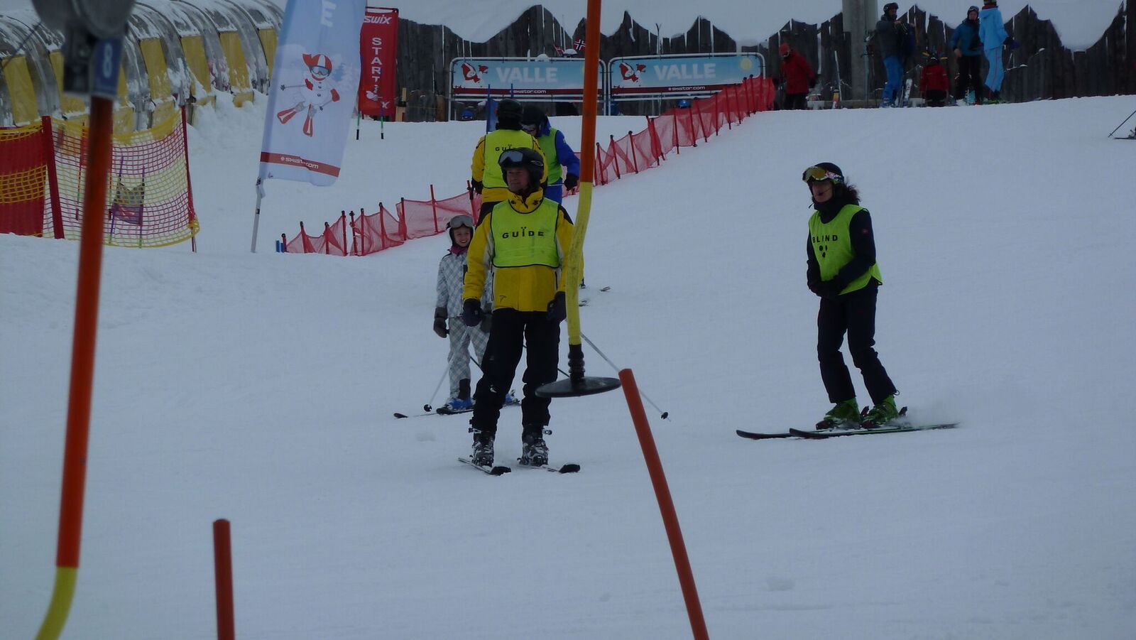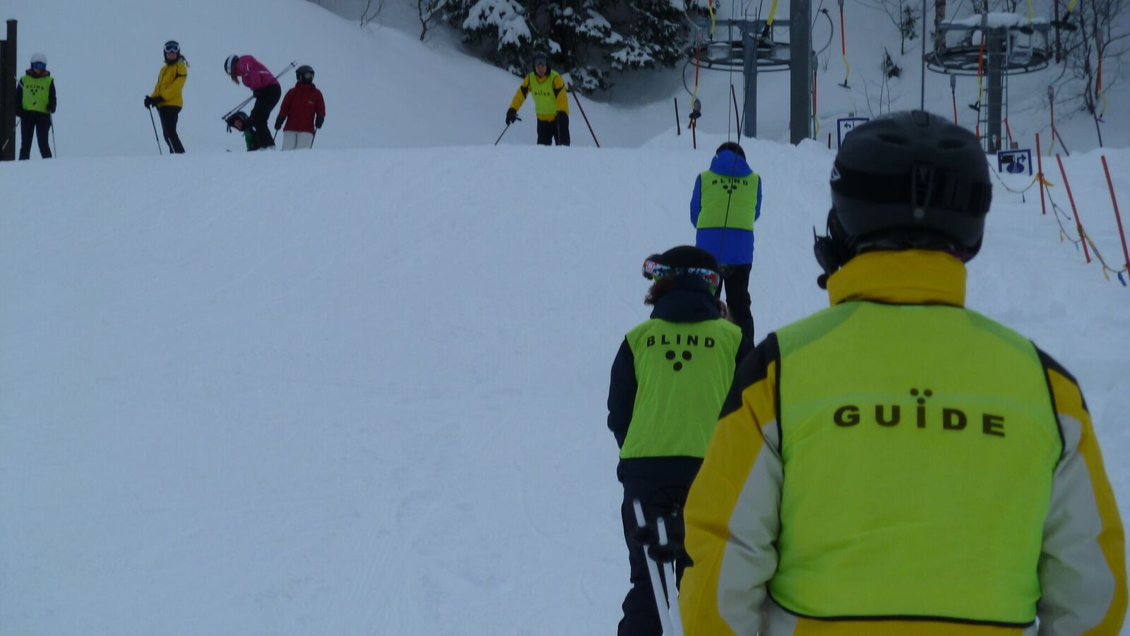 - Guide und sehbehinderte Skifahrerin vor einem Bergpanorama