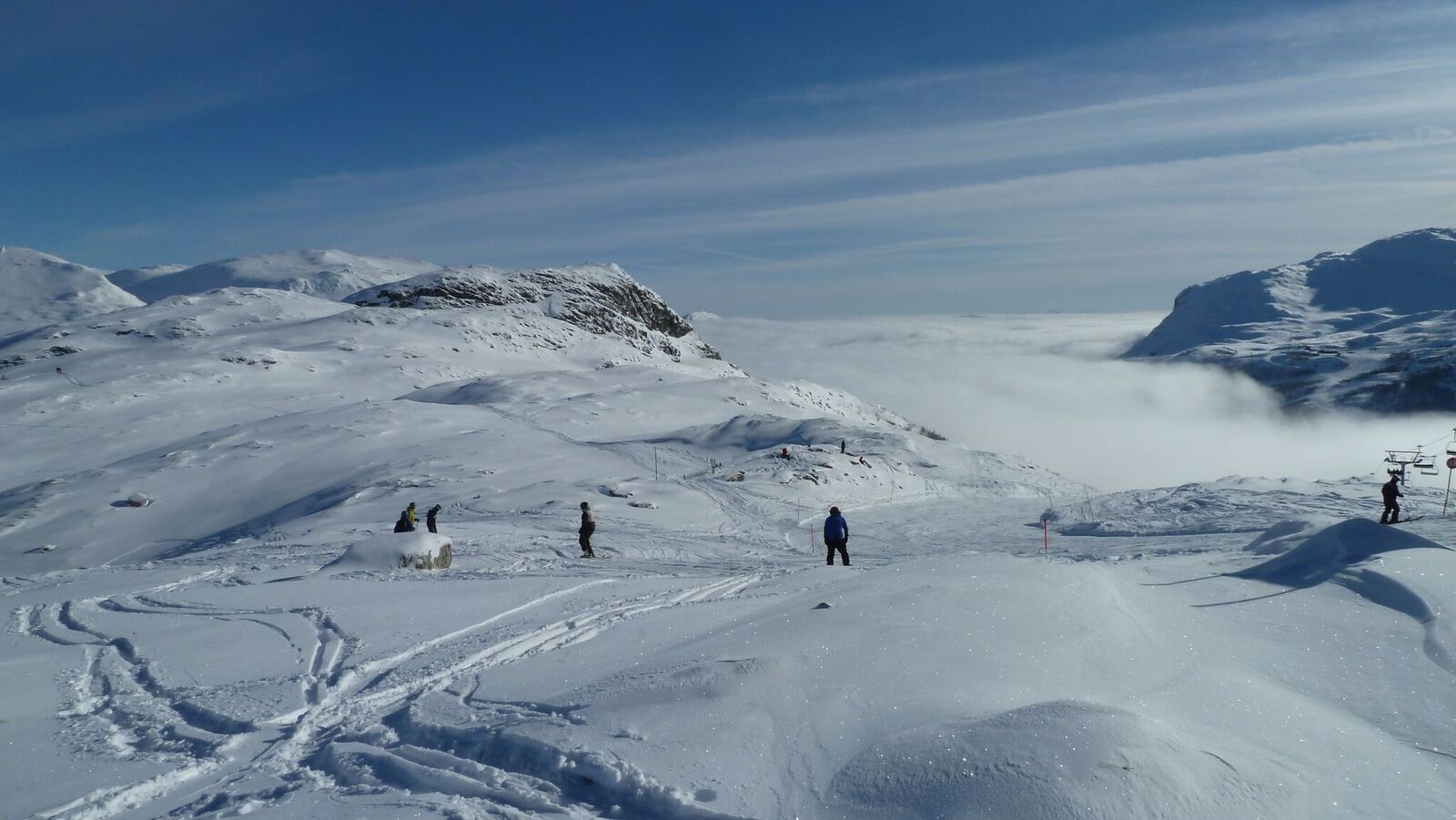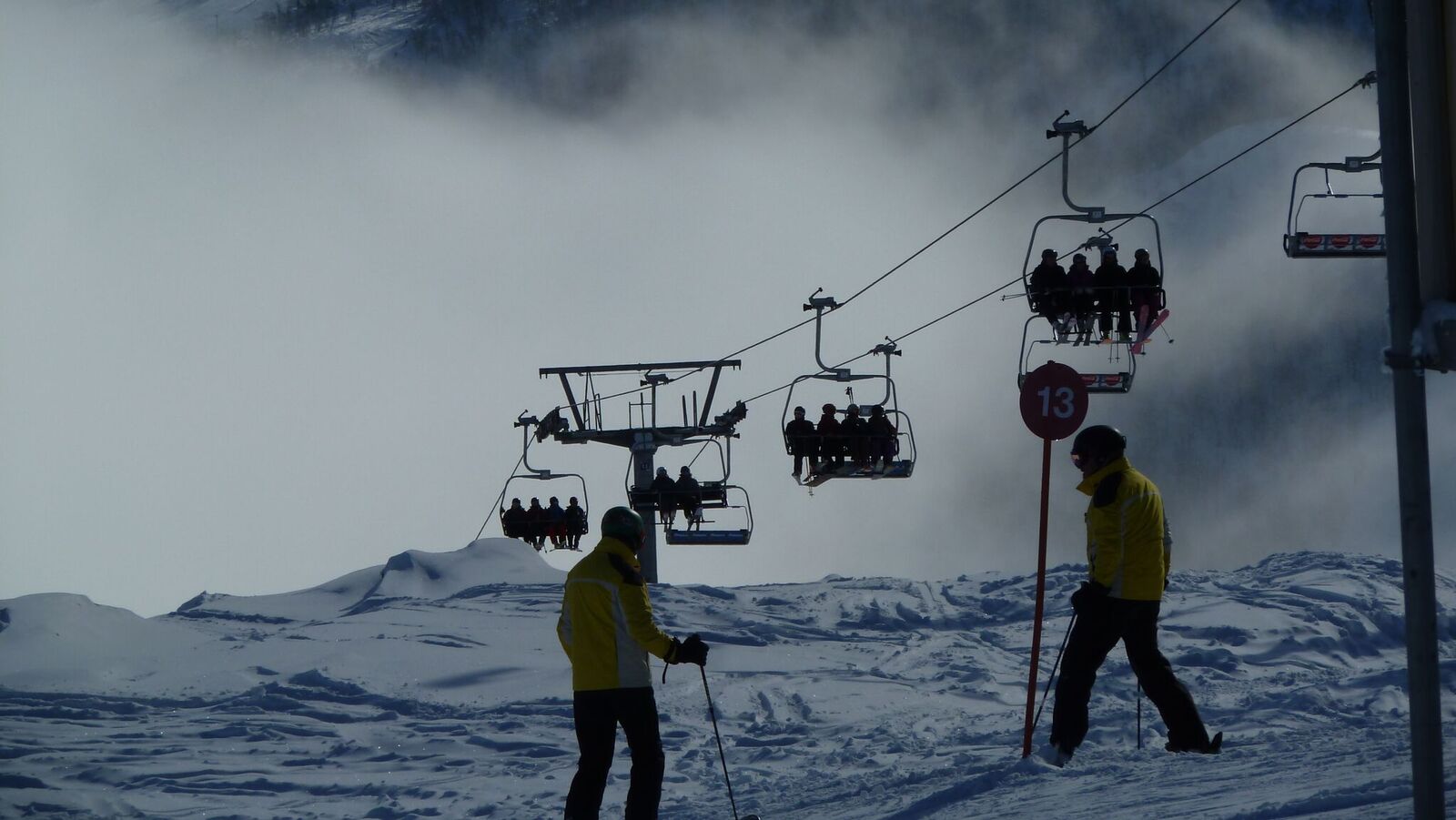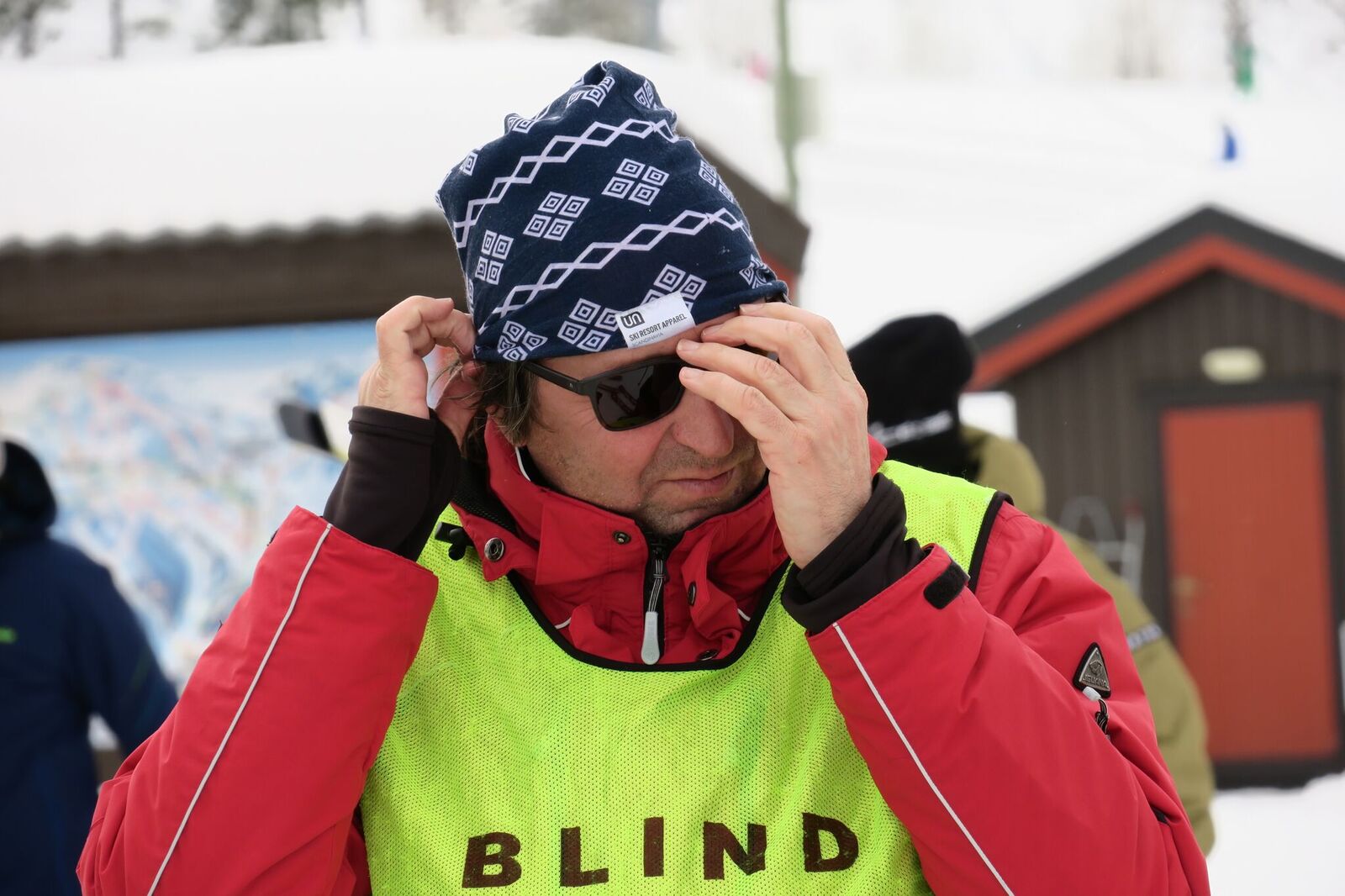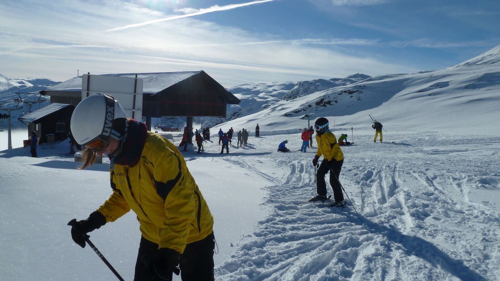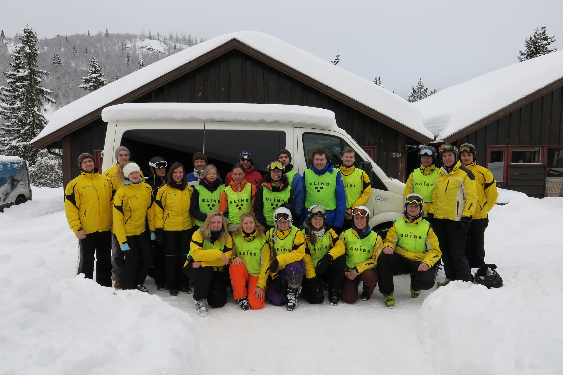 - Guide und sehbehinderte Skifahrerin vor einem Bergpanorama